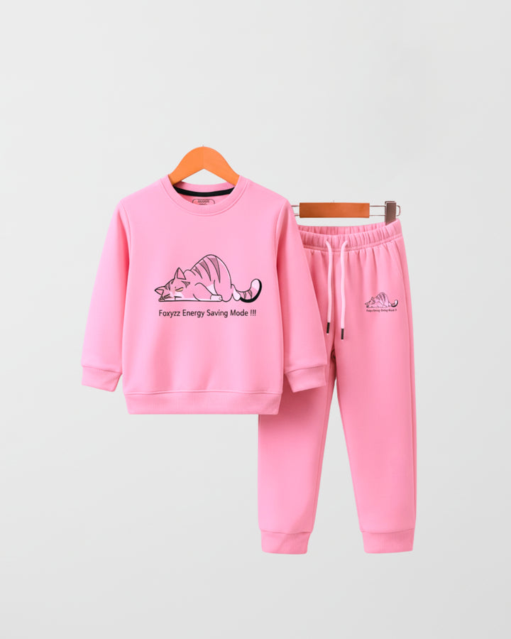 Let your little one enjoy cozy comfort with this playful dark pink set. The drop-shoulder sweatshirt features an adorable "Sleeping Cat" screen print with the fun caption "Energy Saving Mode," perfect for those lazy days. Paired with matching dark pink trousers, both made from a soft LSF 60:40 fabric blend, this outfit is ideal for both relaxation and style. Shape Bright Futures – a free Wisdom Book included with every outfit to inspire young minds!